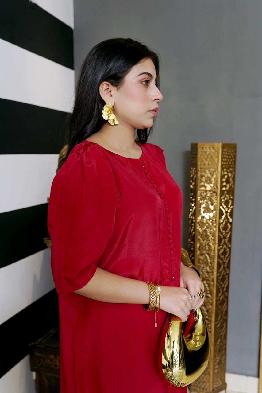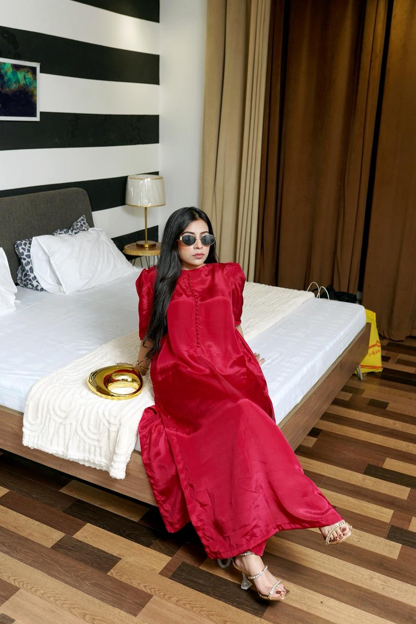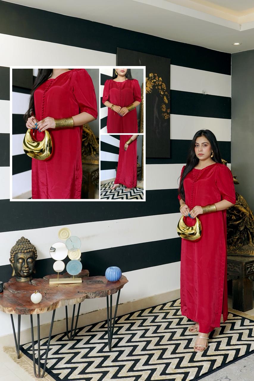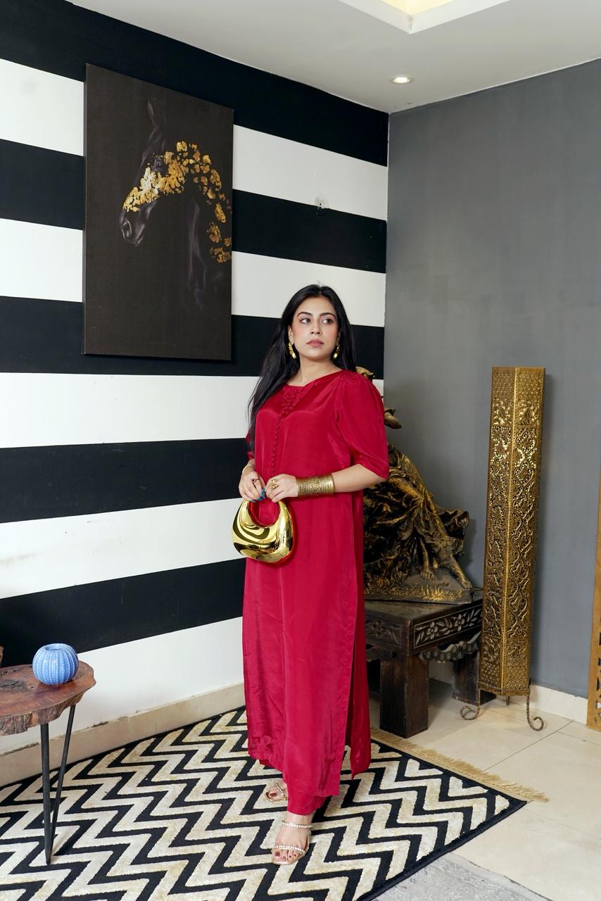 Ratan carries the energy of marigolds, fairy lights, and joyful chaos of weddings. Made with premium Taco Russian Grip fabric, it features delicate handmade button embellishments along the neckline and an intricate floral shoulder design that adds a festive sparkle without being overwhelming.